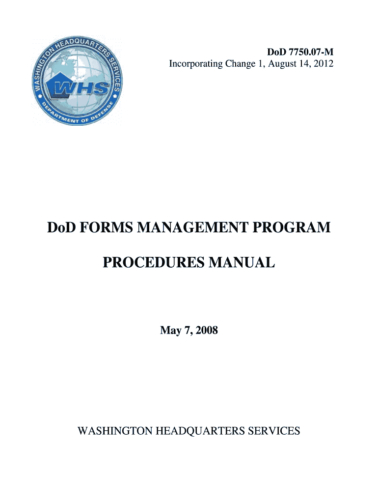DoD 7750.07-M DoD FORMS MANAGEMENT PROGRAM PROCEDURES MANUAL May 14, 2008, WASHINGTON HEADQUARTERS SERVICES DoD 7750.07-M, May 14, 2008, FOREWORD This Manual is issued under the authority of DoD Instruction