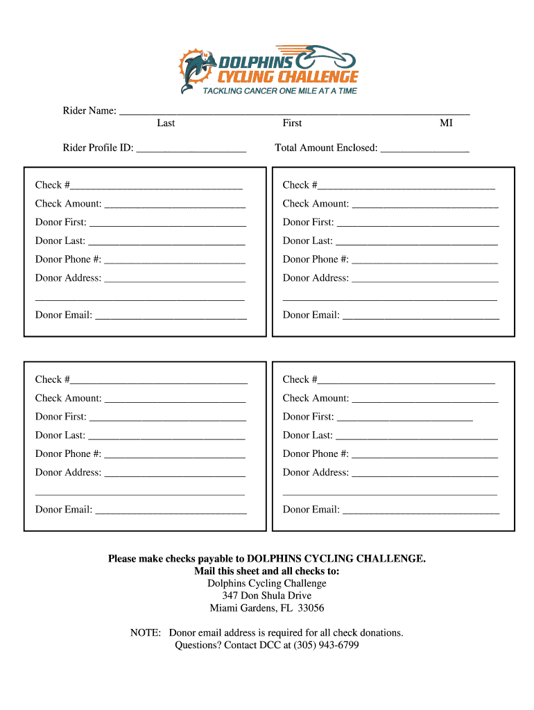 Rider Name: Last First MI Rider Profile ID: Total Amount Enclosed: Check # Check # Check Amount: Check Amount: Donor First: Donor First: Donor Last: Donor Last: Donor Phone #: Donor Phone #: Donor