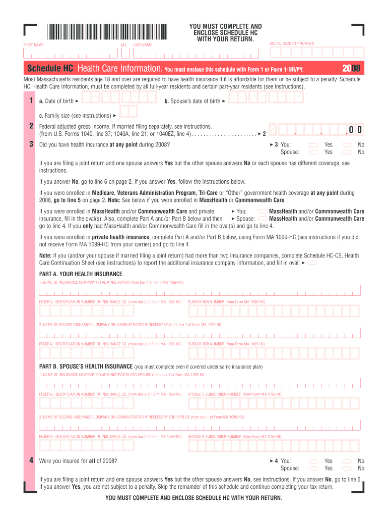 Schedule HC Health Care Information. You must enclose this schedule with Form 1 or Form 1-NR/BY. 2008. Most Massachusetts residents age 18 and over are ...