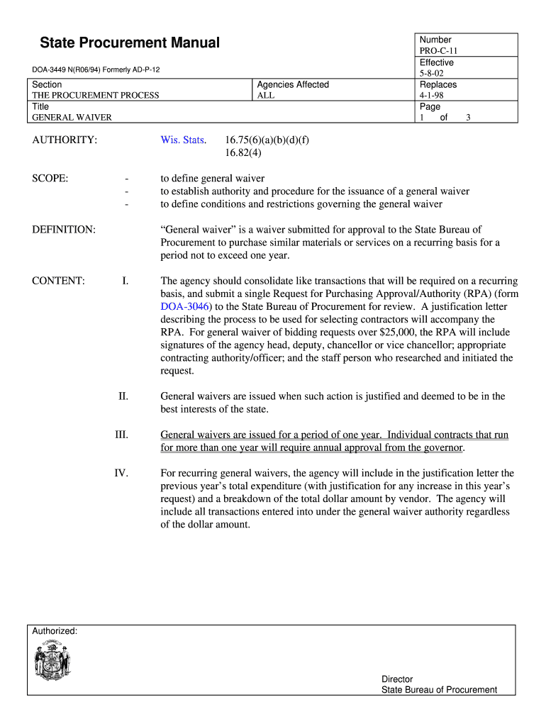 State Procurement Manual DOA-3449 N(R06/94) Formerly AD-P-12 Section THE PROCUREMENT PROCESS Title GENERAL WAIVER Agencies Affected ALL Number PRO-C-11 Effective 5-8-02 Replaces 4-1-98 Page 1 of 3