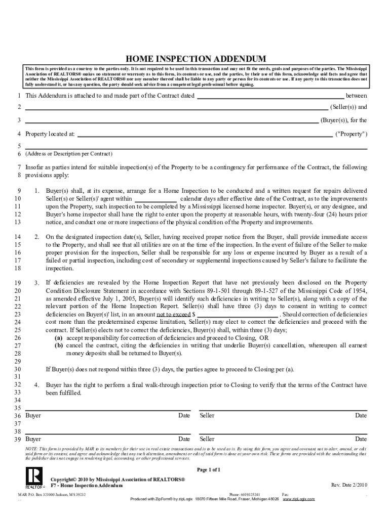 Page 1 of 1 Copyright 2010 by Mississippi Association of REALTORS F7 - Home Inspection Addendum MAR P. 1 This Addendum is attached to and made part of the Contract dated between Seller s and Buyer s for the 4 Property located at Property 6 Address or Description per Contract 7 Insofar as parties intend for suitable inspection s of the Property to be a contingency for performance of the Contract the following 8 provisions apply Buyer s shall at it...