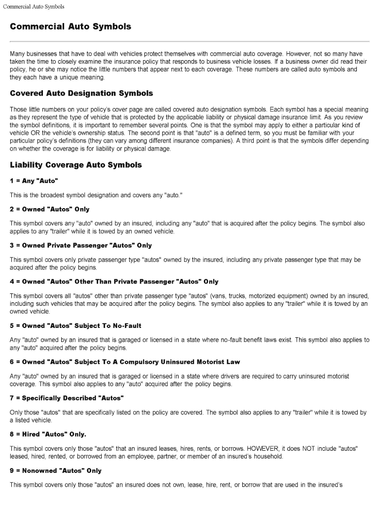 Commercial Auto Symbols. Many businesses that have to deal with vehicles protect themselves with commercial auto coverage. However, not so many have ...