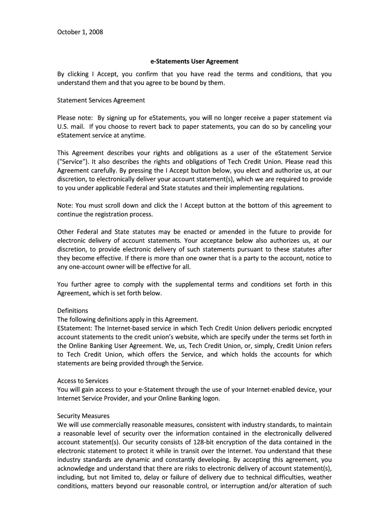 October 1, 2008eStatements User Agreement By clicking I Accept, you confirm that you have read the terms and conditions, that you understand them and that you agree to be bound by them. Statement