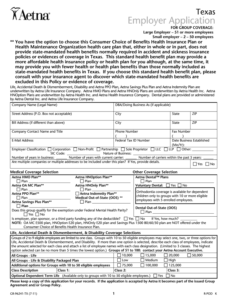 The Texas Employer Health Insurance Application is a business form used by employers in Texas to apply for group health insurance coverage through Aetna.