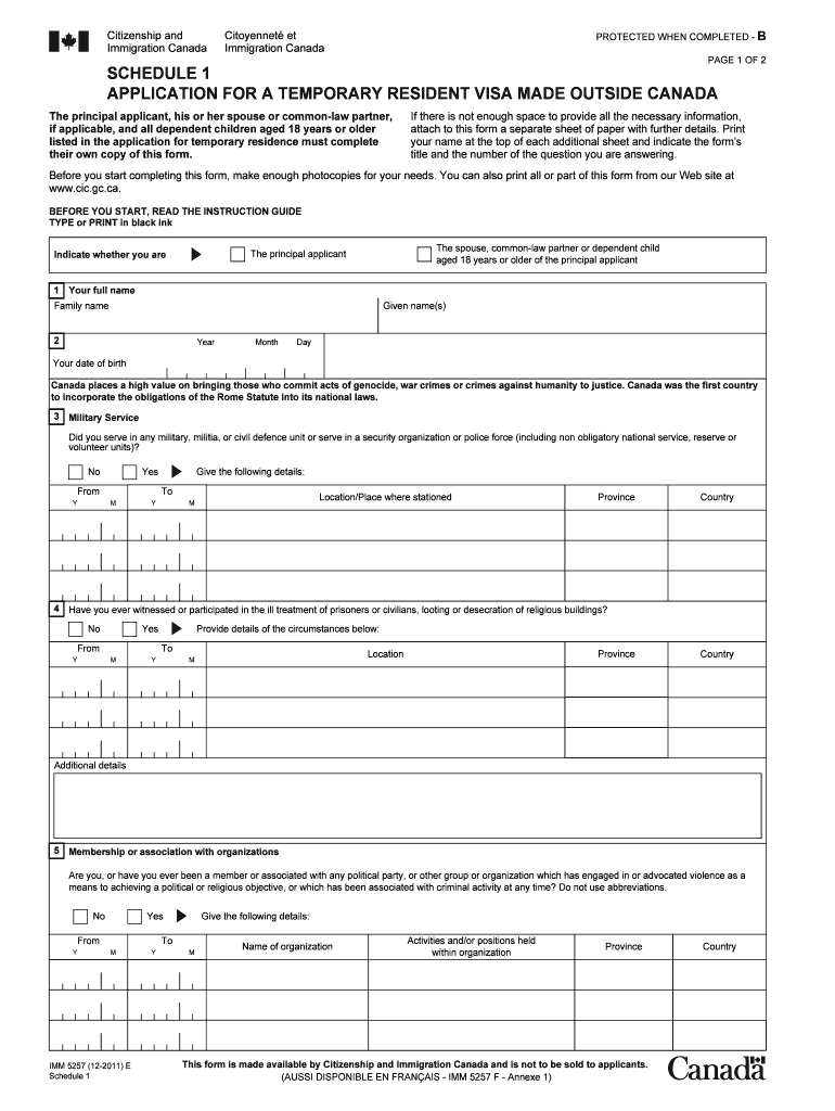 Individuals applying for a Temporary Resident Visa or visitor visa to Canada are required to file imm 5257e schedule 1.