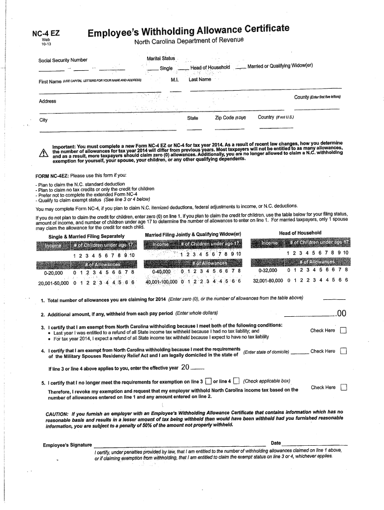 NC-4 '52 Employees's Withholding Allowance Certificate. W b. 1033 North Carolina Department of Revenue. Social Security Number Marital Status. I V r I y.