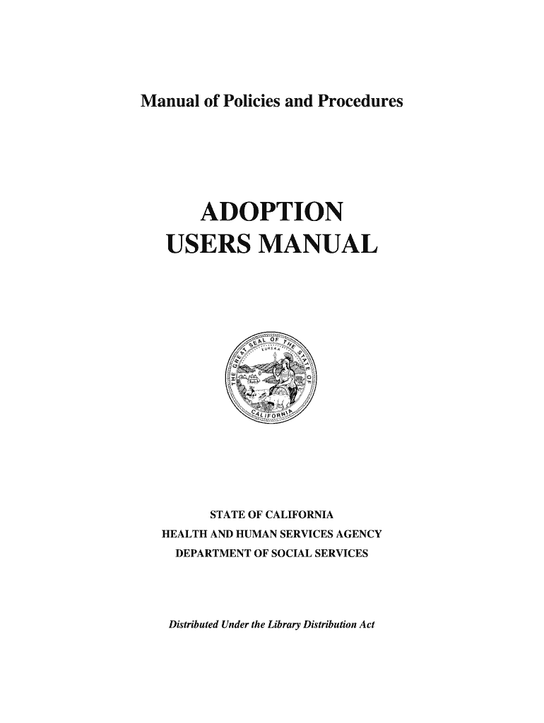 Manual of Policies and Procedures ADOPTION USERS MANUAL STATE OF CALIFORNIA HEALTH AND HUMAN SERVICES AGENCY DEPARTMENT OF SOCIAL SERVICES Distributed Under the Library Distribution Act This page