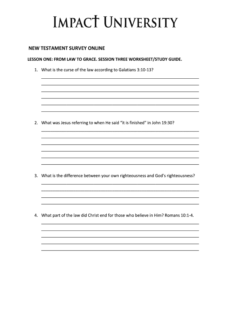 NEW TESTAMENT SURVEY ONLINE LESSON ONE: FROM LAW TO GRACE. SESSION THREE WORKSHEET/STUDY GUIDE. 1. What is the curse of the law according to Galatians 3:10-13? 2. What was Jesus referring to when