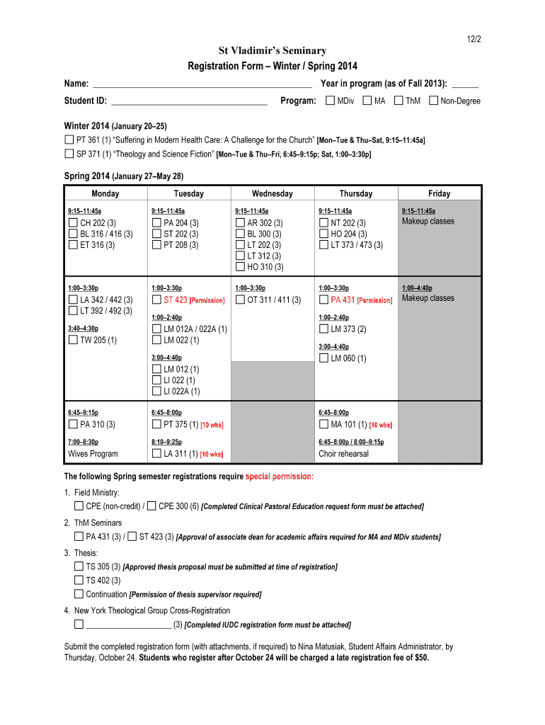 12/2 St Vladimir s Seminary Registration Form Winter / Spring 2014 Name: Year in program (as of Fall 2013): Student ID: Program: MDI MA THM Non-Degree Winter 2014 (January 20 25) PT 361 (1) Suffering