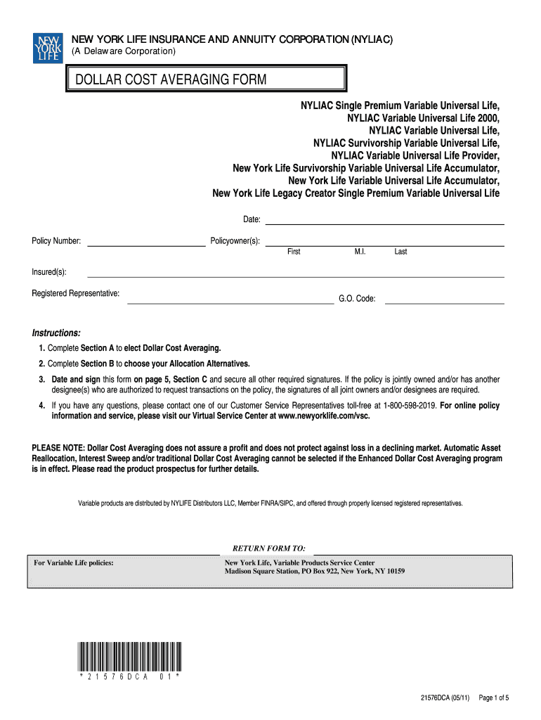 The completed form must be submitted to the Variable Products Service Center of NYLIAC at least five business days prior to the desired start date for Dollar Cost Averaging.