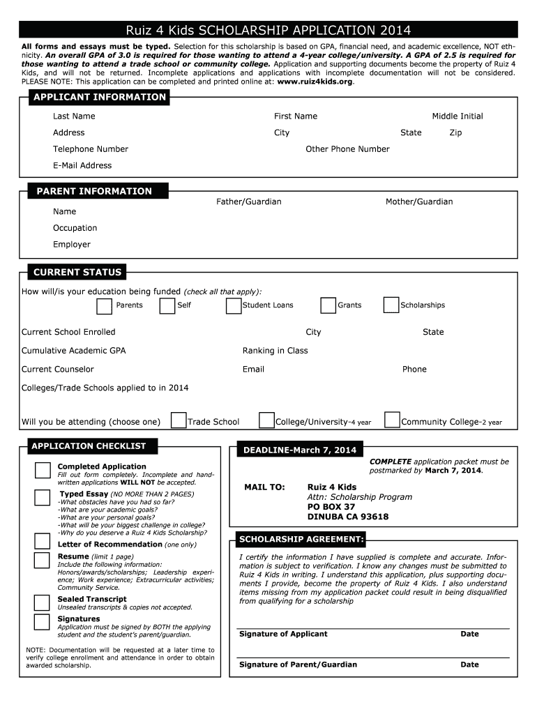 Ruiz 4 Kids SCHOLARSHIP APPLICATION 2014