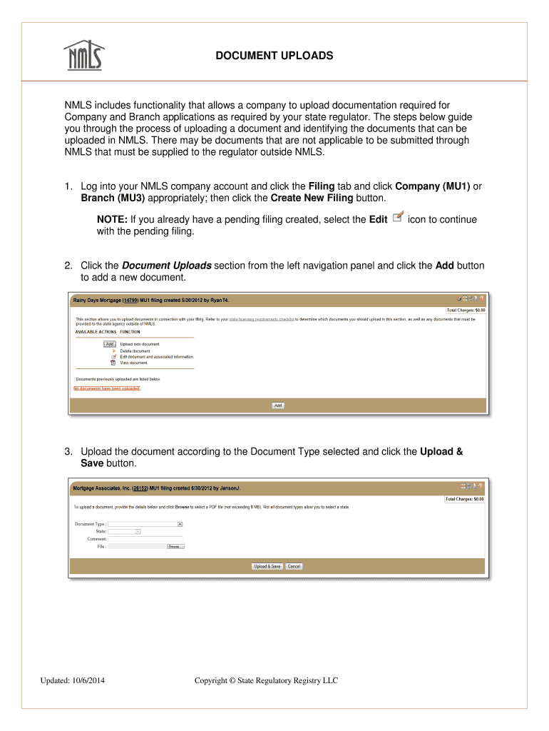 DOCUMENT UPLOADS NLS includes functionality that allows a company to upload documentation required for Company and Branch applications as required by your state regulator. The steps below guide you