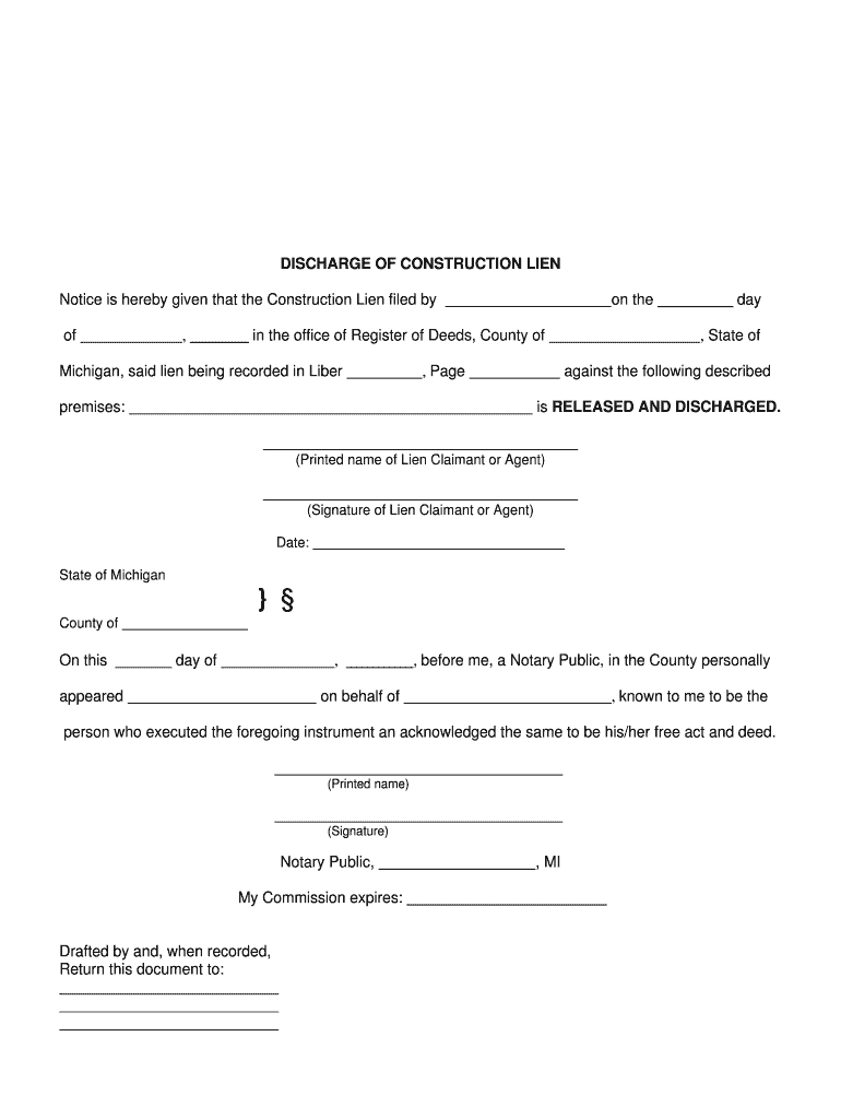 Get the free DISCHARGE OF CONSTRUCTION LIEN - dleg state mi