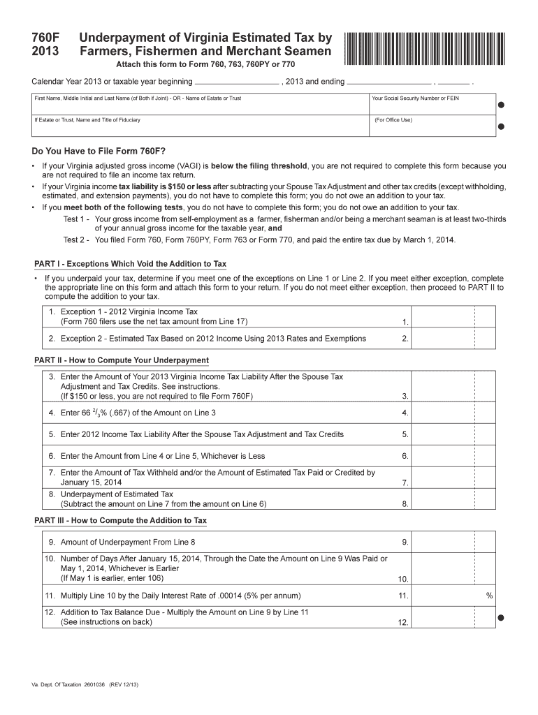 760F 2013 Underpayment of Virginia Estimated Tax by Farmers, Fishermen and Merchant Seamen Attach this form to Form 760, 763, 760PY or 770 Calendar Year 2013 or taxable year beginning *VA760F113000×,
