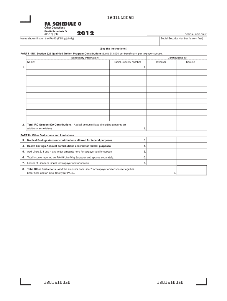 Get the free 2012 PA Schedule O - Other Deductions (PA-40 O) - Portal.state.pa.us