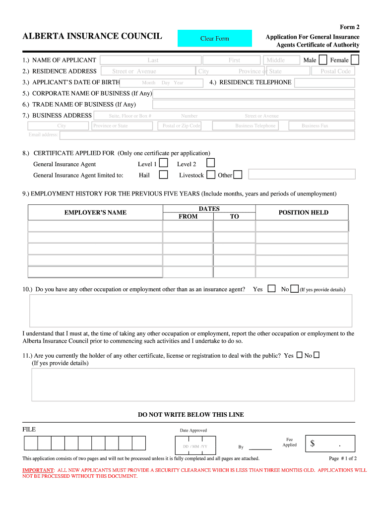 Form 2 ALBERTA INSURANCE COUNCIL 1.) NAME OF APPLICANT 2.) RESIDENCE ADDRESS Last First Street or Avenue 3.) APPLICANT S DATE OF BIRTH Month Application For General Insurance Agents Certificate of