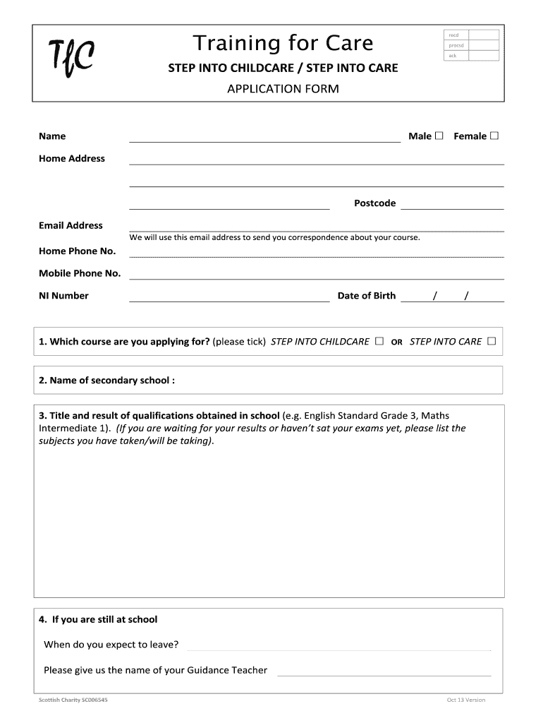 Training for Care recd process ACK STEP INTO CHILDCARE / STEP INTO CARE APPLICATION FORM Name Home Address Male ? Female ? Postcode Email Address We will use this email add.