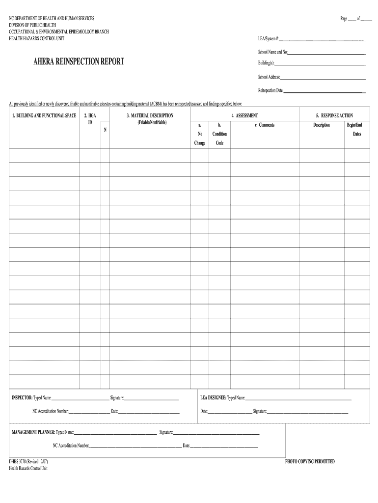 NC DEPARTMENT OF HEALTH AND HUMAN SERVICES DIVISION OF PUBLIC HEALTH OCCUPATIONAL & ENVIRONMENTAL EPIDEMIOLOGY BRANCH HEALTH HAZARDS CONTROL UNIT Page of LEA/System #: School Name and No: HERA INSPECTION