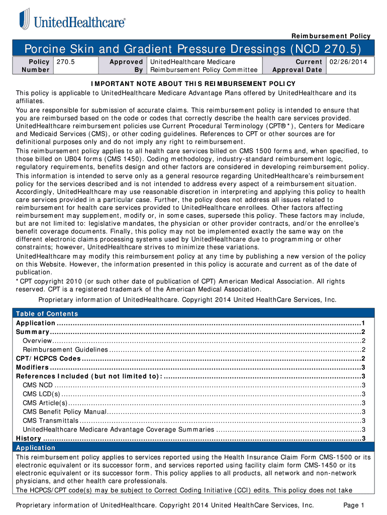 Reimbursement Policy Porcine Skin and Gradient Pressure Dressings (NCD 270.5) Policy Number 270.5 Approved By UnitedHealthcare Medicare Reimbursement Policy Committee Current Approval Date 02/26/2014
