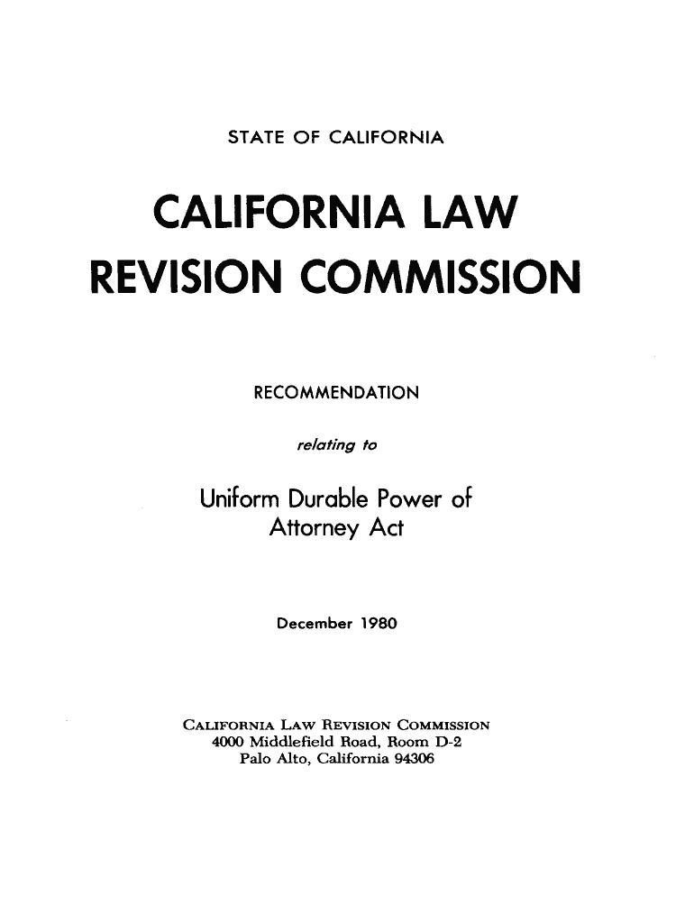 STATE OF CALIFORNIA LAW REVISION COMMISSION RECOMMENDATION relating for Uniform Durable Power of Attorney Act December 1980 Law REVISION COMMISSION 4000 Middle field Road, Room D-2 Palo Alto, California