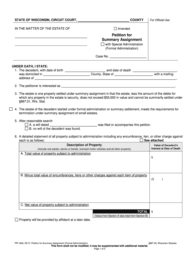 STATE OF WISCONSIN, CIRCUIT COURT, COUNTY IN THE MATTER OF THE ESTATE OF For Official Use Amended Petition for Summary Assignment with Special Administration (Formal Administration) Case No. UNDER