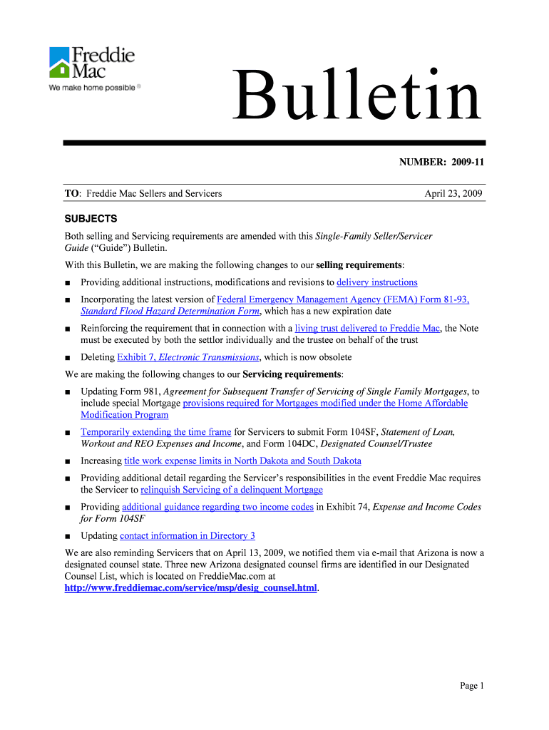 Bulletin NUMBER: 2009-11 TO: Freddie Mac Sellers and Services April 23, 2009, SUBJECTS Both selling and Servicing requirements are amended with this Single-Family Seller/Service Guide (Guide) Bulletin.