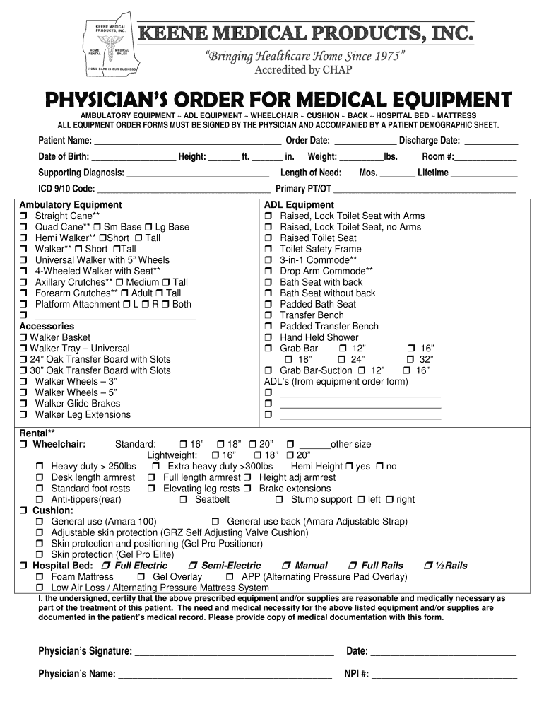 Get the free PHYSICIAN S ORDER FOR MEDICAL EQUIPMENT AMBULATORY EQUIPMENT ADL EQUIPMENT WHEELCHAI...