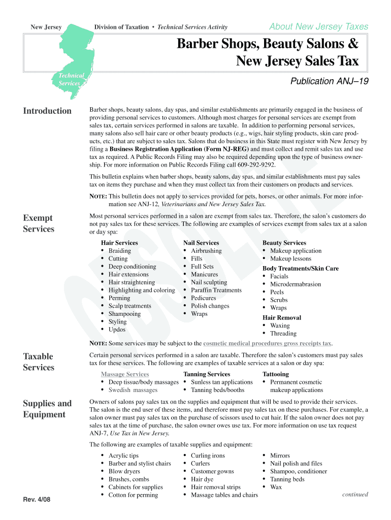 New Jersey Division of Taxation u About New Jersey Taxes Technical Services Activity Barber Shops, Beauty Salons & New Jersey Sales Tax Technical Services Introduction Publication ANJ 19 Barber shops,