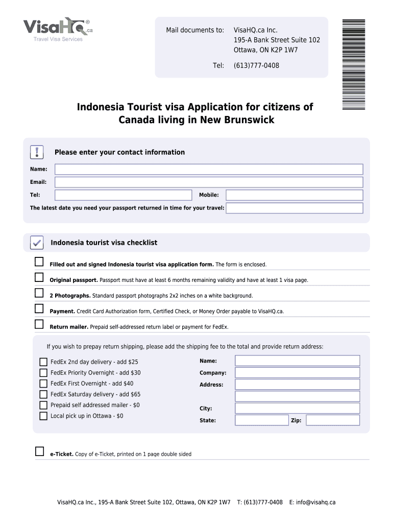 Mail documents to: Tel: Visa HQ.ca Inc. 195-A Bank Street Suite 102 Ottawa, ON K2P 1W7 (613)777-0408 Indonesia Tourist visa Application for citizens of Canada living in Alberta Please enter your contact