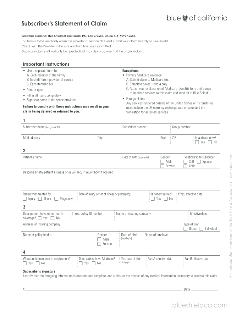 Subscriber s Statement of Claim Send this claim to: Blue Shield of California, P.O. Box 272540, Chico, CA, 95927-2540. This form is to be used only when the provider of service does not submit your