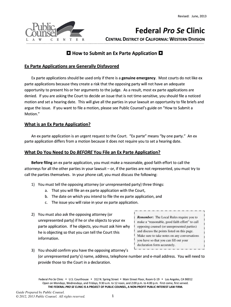 Revised: June 2013 Federal Pro Se Clinic CENTRAL DISTRICT OF CALIFORNIA: WESTERN DIVISION How to Submit an Ex Parte Application Ex Parte Applications are Generally Disfavored Ex parte applications