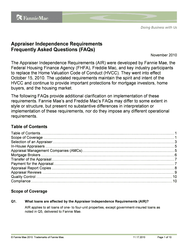 Appraiser Independence Requirements Frequently Asked Questions (FAQs) November 2010 The Appraiser Independence Requirements (AIR) were developed by Fannie Mae, the Federal Housing Finance Agency (FIFA),