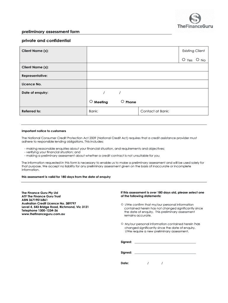 Preliminary assessment form private and confidential Client Name (s): Existing Client ? Yes ? No Client Name (s): Representative: License No. Date of inquiry: / ? Meeting Referred to: / ? Phone Bank: