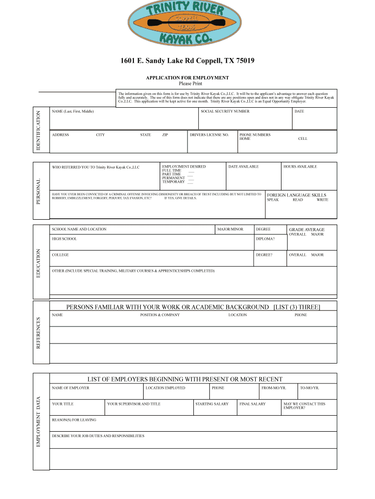 1601 E. Sandy Lake Rd Copper, TX 75019 APPLICATION FOR EMPLOYMENT Please Print IDENTIFICATION The information given on this form is for use by Trinity River Kayak Co., LLC. It will be to the applicant