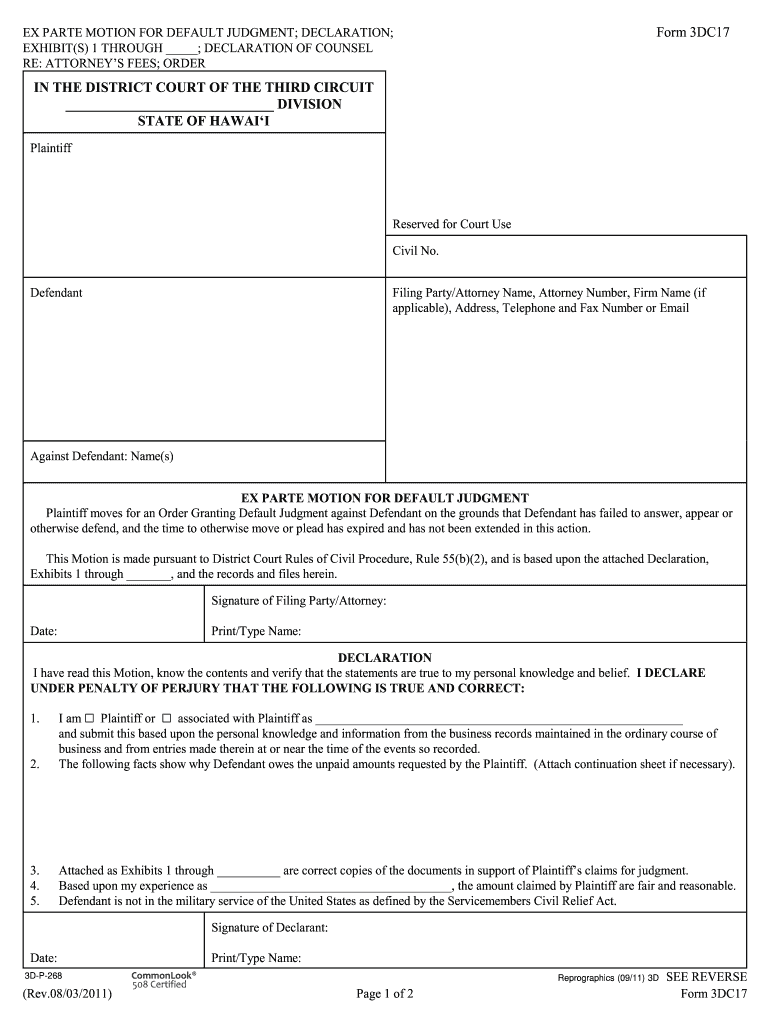EX PARTE MOTION FOR DEFAULT JUDGMENT; DECLARATION; EXHIBIT(S) 1 THROUGH ; DECLARATION OF COUNSEL RE: ATTORNEY S FEES; ORDER Form 3DC17 IN THE DISTRICT COURT OF THE THIRD CIRCUIT DIVISION STATE OF