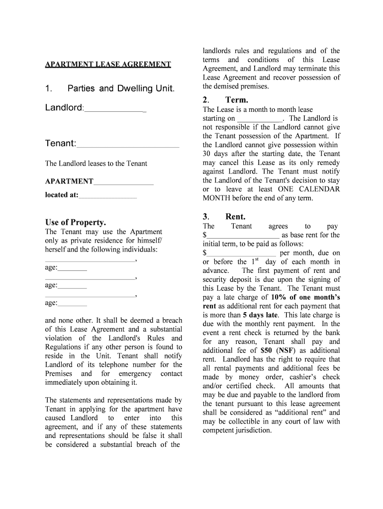 APARTMENT LEASE AGREEMENT 1. Parties and Dwelling Unit. Landlord: Tenant: The Landlord leases to the Tenant APARTMENT located at: Use of Property. The Tenant may use the Apartment only as private