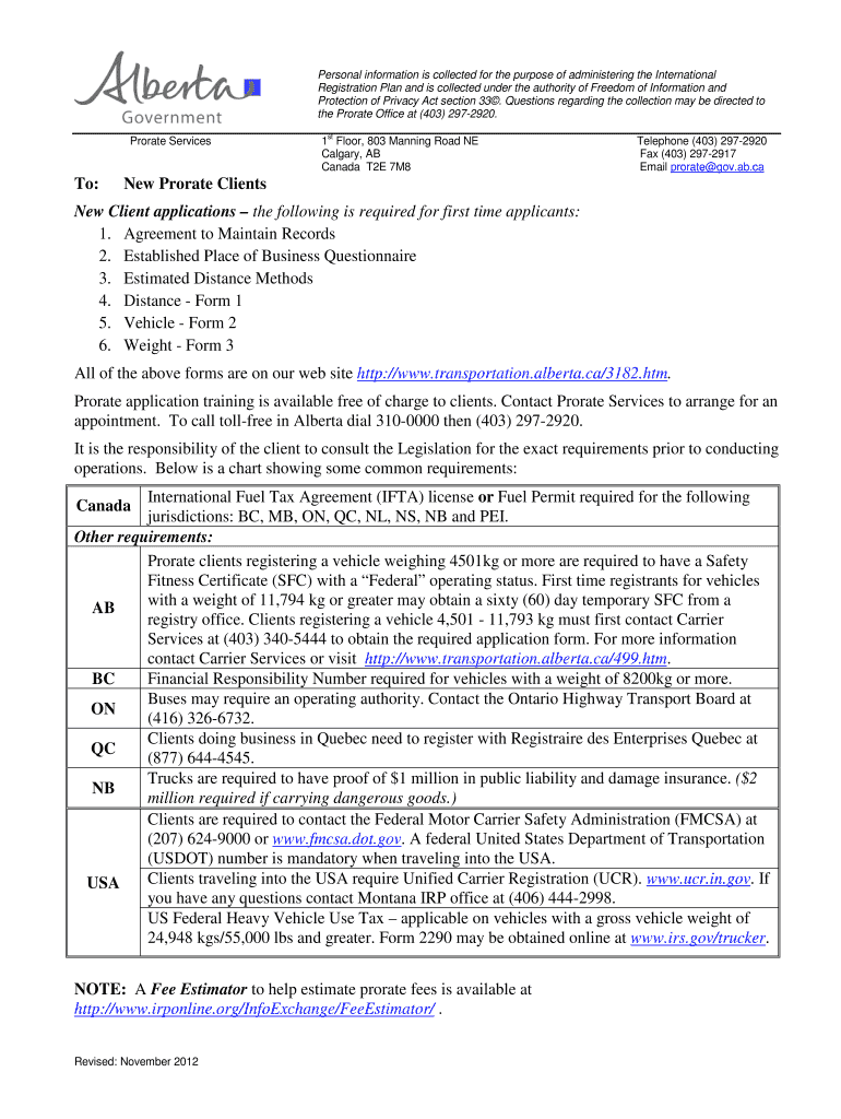 Information such as vehicle details, intended operating jurisdictions, and proof of insurance must be reported on to new prorate clients.