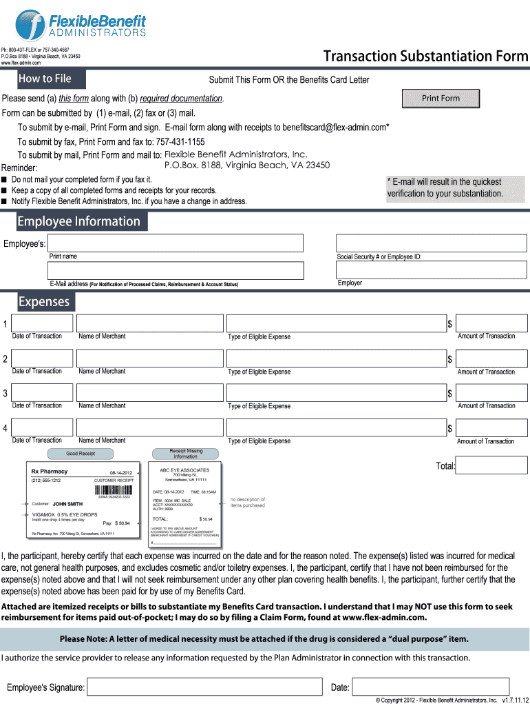 PH: 800-437-FLEX or 757-340-4567 P.O. Box 8188 Virginia Beach, VA 23450 www.flex-admin.com How to File Transaction Substantiation Form Submit This Form OR the Benefits Card Letter Print Form Please