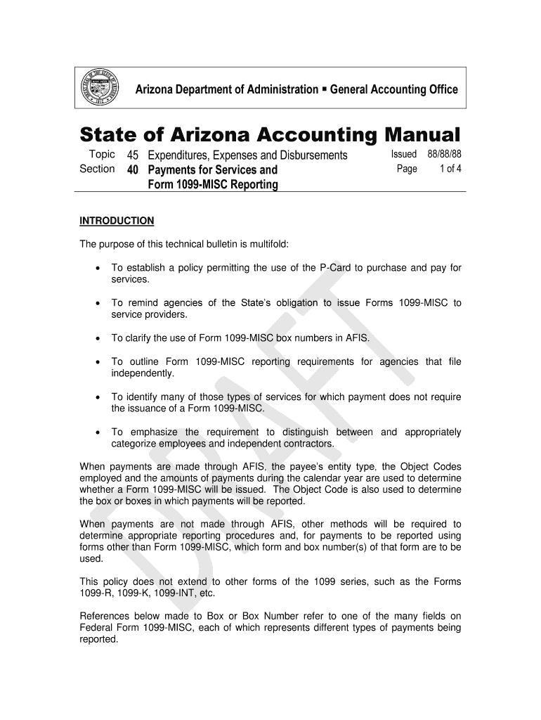 Arizona Department of Administration ? General Accounting Office State of Arizona Accounting Manual Topic Section 45 Expenditures, Expenses and Disbursements 40 Payments for Services and Form 1099-MISC