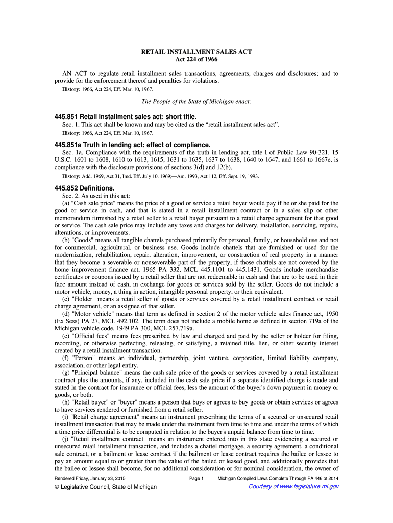 Get the free RETAIL INSTALLMENT SALES ACT Act 224 of 1966 AN ACT to ... - legislature mi