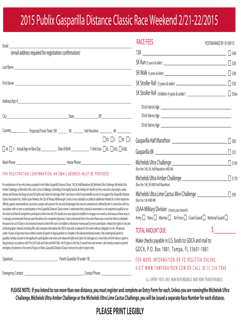 2015 Publix Sarsaparilla Distance Classic Race Weekend 2/21-22/2015 Email Last Name First Name Address/Apt. # City State ZIP Country Projected Finish Time: 15K 5K Half Marathon 8K XS M F Actual Age
