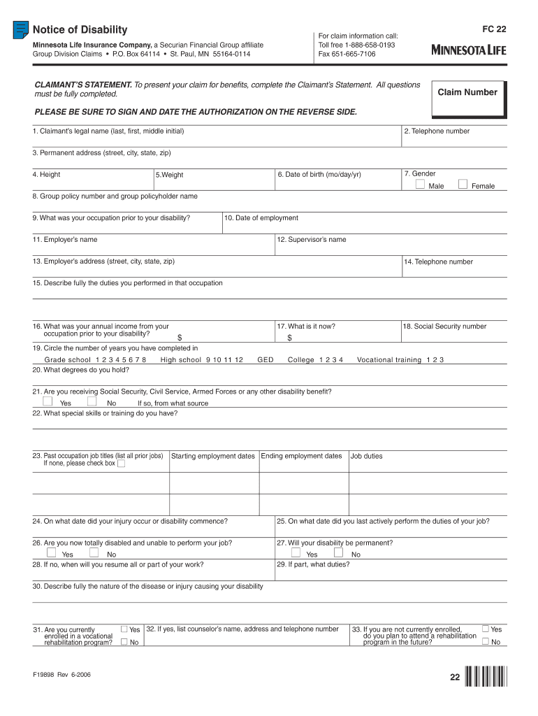 Clear Form Notice of Disability For claim information call: Toll free 1-888-658-0193 Fax 651-665-7106 Minnesota Life Insurance Company, a Security Financial Group affiliate Group Division Claims P.O.