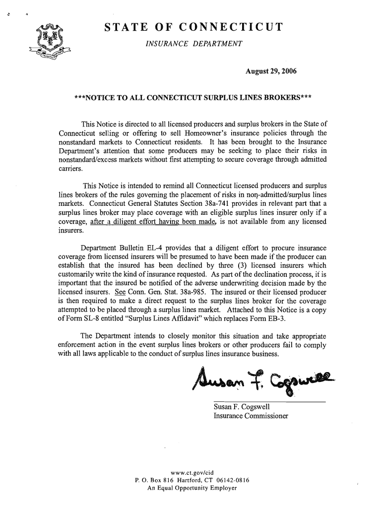 STATE CONNECTICUT INSURANCE DEPARTMENT August 29, 2006 ***NOTICE TO ALL CONNECTICUT SURPLUS LINES BROKERS*** This Notice is directed to all licensed producers and surplus brokers in the State of Connecticut