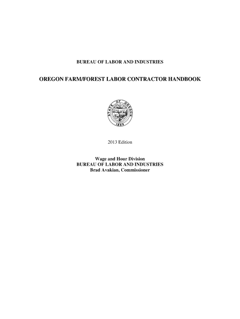 BUREAU OF LABOR AND INDUSTRIES OREGON FARM/FOREST LABOR CONTRACTOR HANDBOOK 2013 Edition Wage and Hour Division BUREAU OF LABOR AND INDUSTRIES Brad Arabian, Commissioner To Our Readers This book is