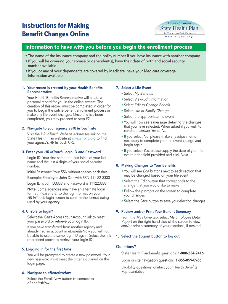 Instructions for Making Benefit Changes Online Information to have with you before you begin the enrollment process The name of the insurance company and the policy number if you have insurance with