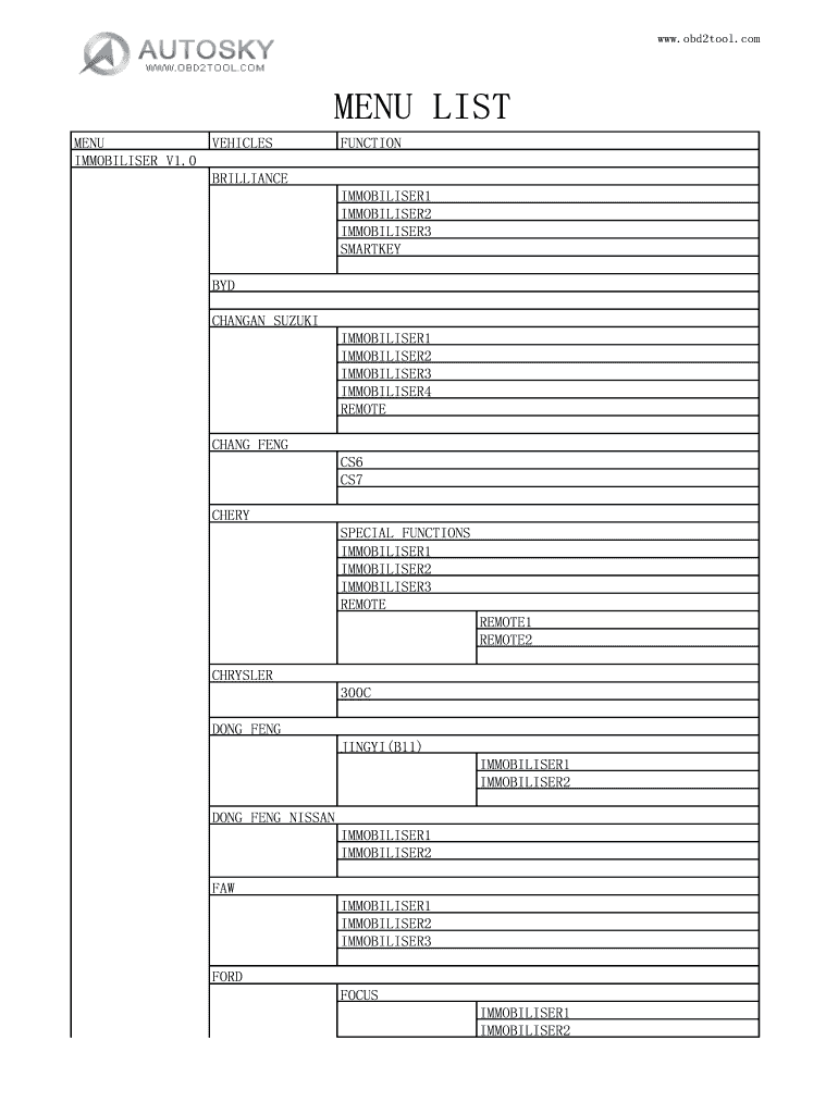 WWW.obd2tool.com MENU LIST MENU Immobilizer V1.0 VEHICLES FUNCTION BRILLIANCE IMMOBILISER1 IMMOBILISER2 IMMOBILISER3 SMARTER BYD CHANGE SUZUKI IMMOBILISER1 IMMOBILISER2 IMMOBILISER3 IMMOBILISER4 REMOTE