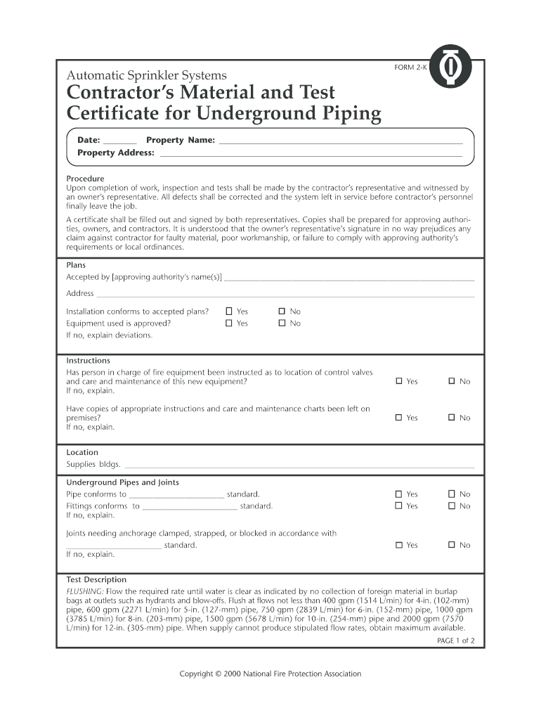 FORM 2-K Automatic Sprinkler Systems Contractor s Material and Test Certificate for Underground Piping Date: Property Name: Property Address: Procedure Upon completion of work, inspection and tests