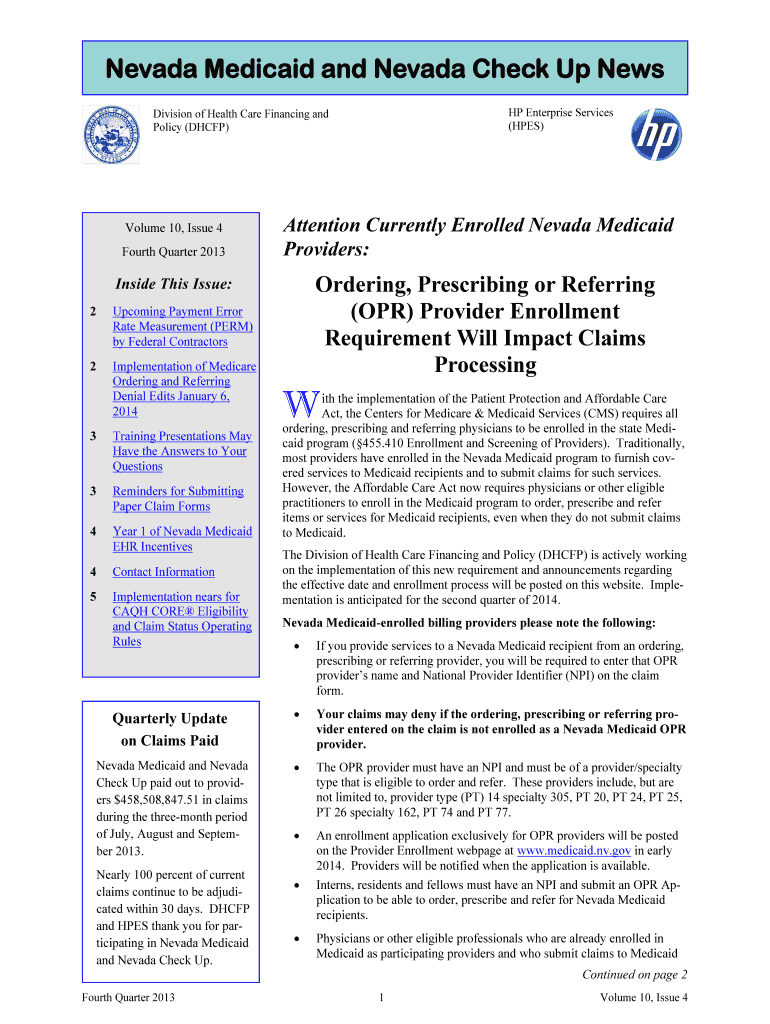 Nevada Medicaid and Nevada Check Up News HP Enterprise Services (HOPES) Division of Health Care Financing and Policy (DHCP) Volume 10, Issue 4 Fourth Quarter 2013 Attention Currently Enrolled Nevada