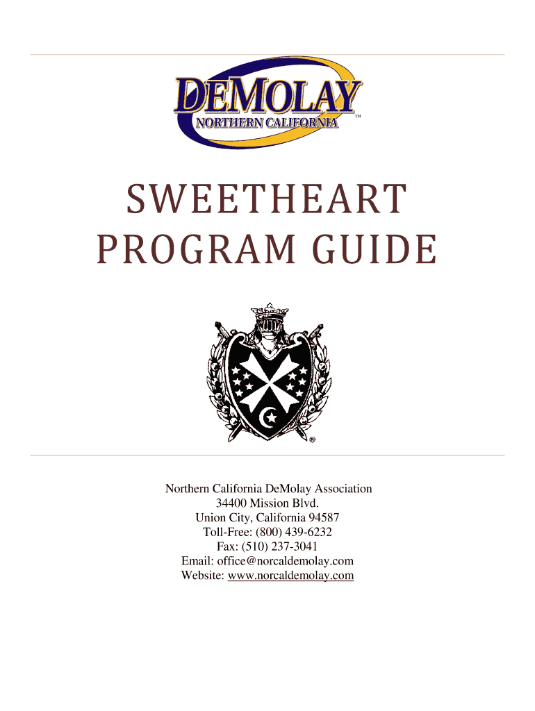 SWEETHEART PROGRAM GUIDE Northern California Demo lay Association 34400 Mission Blvd. Union City, California 94587 Toll-Free: (800) 439-6232 Fax: (510) 237-3041 Email: office norcaldemolay.com Website: