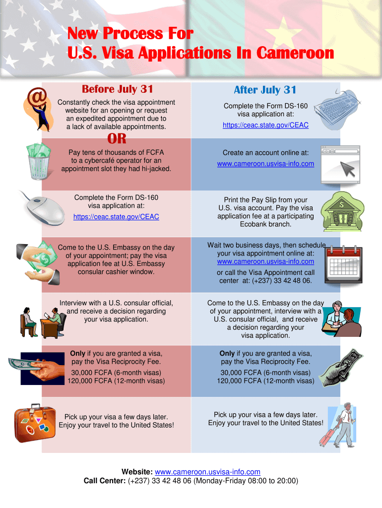 New Process For U.S. Visa Applications In Cameroon Before July 31 Constantly check the visa appointment website for an opening or request an expedited appointment due to a lack of available appointments.